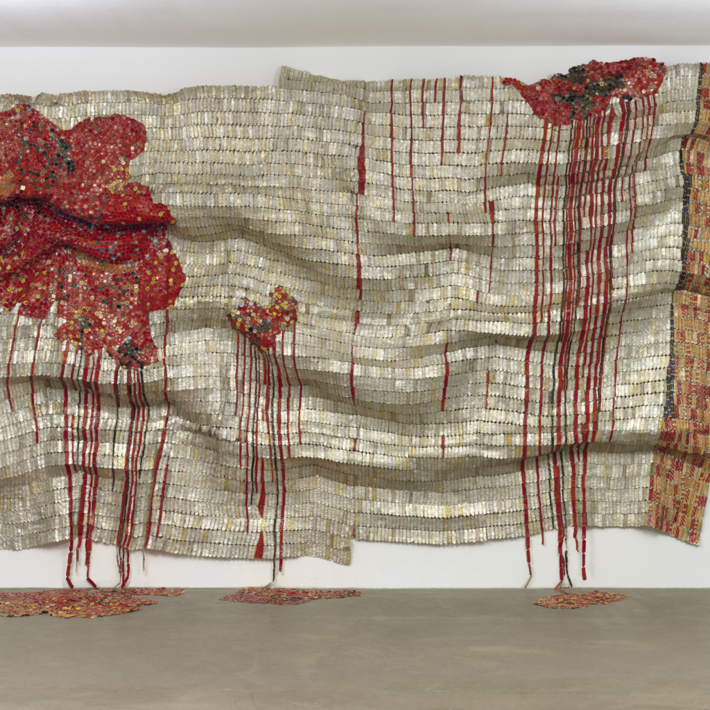 Ao reorganizar resíduos industriais em superfícies monumentais, Anatsui revela como mercadorias aparentemente banais carregam memória histórica e violência econômica. O material torna-se arquivo.